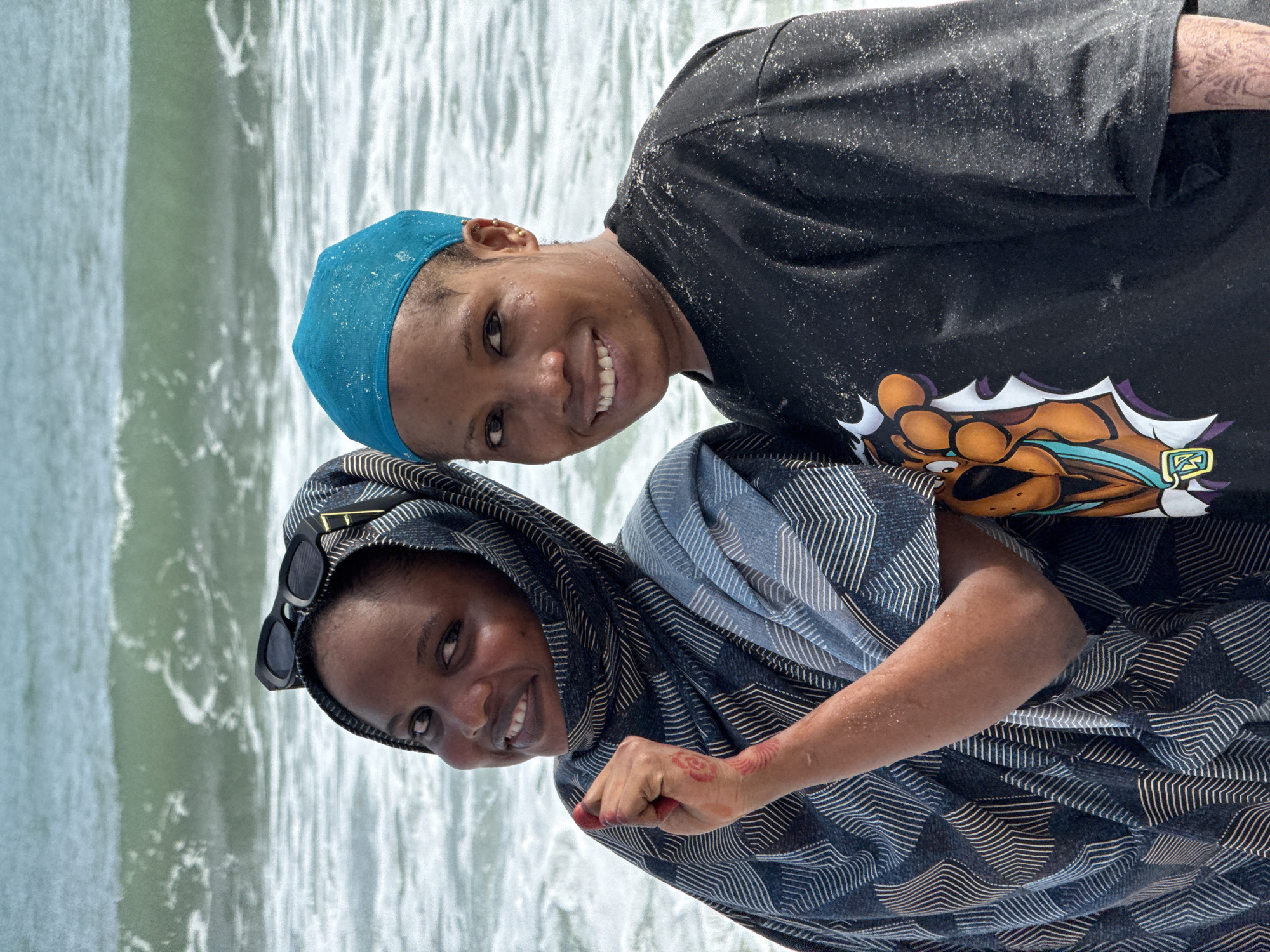 Two Black women are posing for a photograph on a beach at Mopo Onijebu, Nigeria
