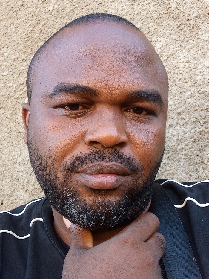 A close-up portrait of an adult male is presented against a textured, light brown stucco wall in Sabon Tasha, Nigeria