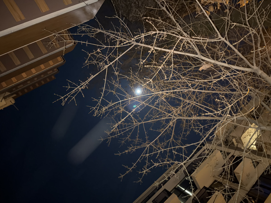 The image presents a nighttime upward view within the city of Sofia, Bulgaria. The scene is dominated by the skeletal network of bare, deciduous tree branches, indicative of a winter or late autumn season, occupying the midground and lower frame. The branches, devoid of foliage, are sharply defined against the dark blue sky. A bright, circular light source, consistent with either a full moon or a powerful streetlamp, is visible through the branches in the upper-center, producing a noticeable lens flare. Two distinct, parallel streaks of light, possibly atmospheric phenomena or camera artifacts, are present in the upper-left quadrant of the sky. Small, faint celestial bodies, likely stars, are discernible in the dark expanse of the sky. Two multi-story buildings are partially visible. On the left, a modern structure with light-toned facades and multiple balconies extends from the lower-left to the mid-left. Illumination from within some of its windows suggests interior activity. On the upper-right, a contrasting building with darker, possibly brown or reddish-brown paneling or brickwork, rises from the mid-right edge, revealing several upper floor levels and a roofline. No individuals are depicted, and no explicit actions or interactions are observed. A solitary, dried, brown leaf remains attached to a branch in the lower-right portion of the tree. The environment is illuminated by the prominent light source and ambient urban glow.