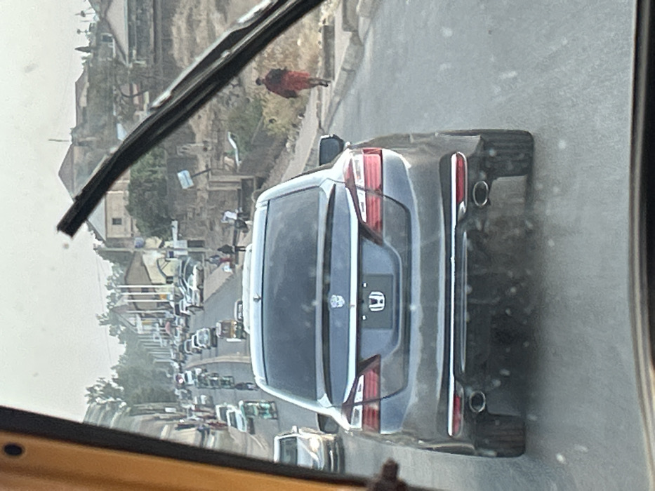 A gray Honda Accord is closely followed, as seen from another vehicle's perspective through a windshield. The Honda's rear features distinctive taillights, a license plate, and dual exhaust pipes. A pedestrian in red is walking on the side of the road. In the distance, a densely packed line of cars is visible, suggesting heavy traffic. The scenery includes buildings and trees, all slightly obscured by a hazy atmosphere.