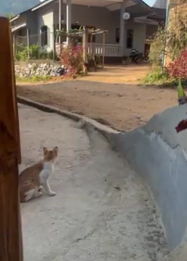 tan and white cat sitting on a concrete path, looking to the left. Behind the cat, the path turns into a dirt road lined with vegetation on the left and a short, concrete wall on the right. Across the road is a one-story house with a gray exterior, a porch, and a satellite dish on the roof. A man in jeans and a dark shirt walks toward the camera on the dirt road, from the left toward the house. In the distance, a mountain is visible. The sky is clear and blue. A wooden frame is visible on the left side of the frame, partially obscuring the view.