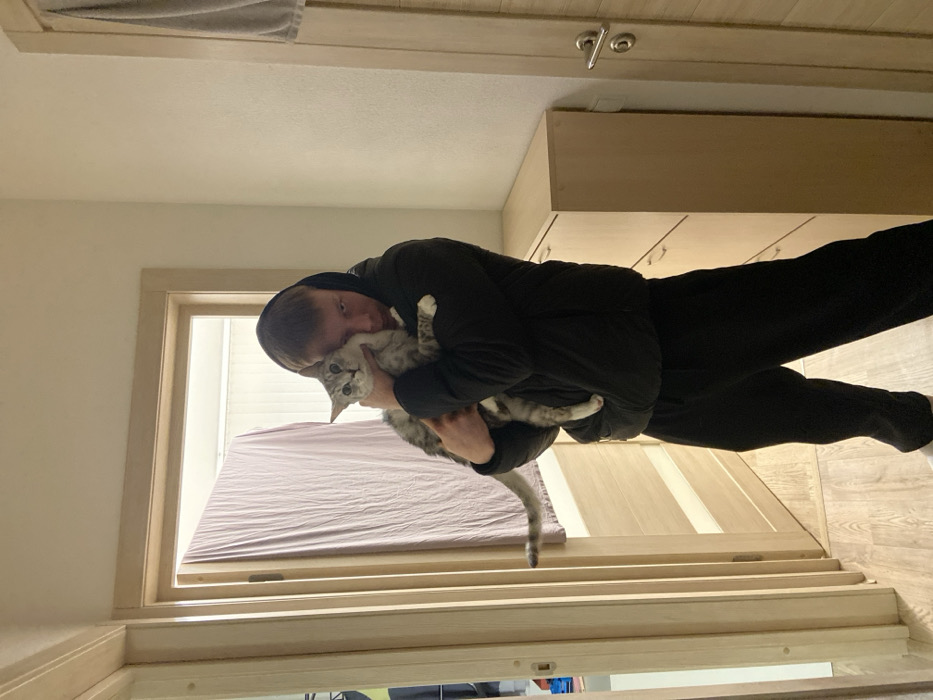 The scene is an indoor domestic setting, likely a hallway or room, in Vsevolozhsk, Russia. A male individual, appearing to be an adult or late teenager with short light brown hair, stands centrally, facing the camera. He is wearing a black hooded puffer jacket with the hood up and black sweatpants. He holds a short-haired grey tabby cat, featuring white paws and muzzle, close to his chest with both arms. The cat's head is turned towards the camera, displaying wide, light-colored eyes. The flooring is light-colored wood or laminate. To the left of the male, a light-colored wooden door is open, revealing a background space containing what appears to be a light purple curtain or fabric. To the right, a closed light-colored wooden door with a chrome handle is partially visible, above which a grey towel or fabric is draped. Adjacent to this door, a light-colored wooden shoe cabinet or dresser with three horizontal compartments is positioned against the wall. The surrounding walls are plain and light-colored. Illumination is consistent with indoor artificial lighting.