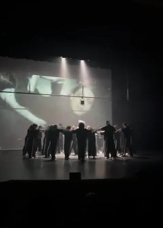 group of people dressed in black standing in a circle on a stage. They are facing away from the camera and have their arms extended to form a closed circle. Above them, a black-and-white video is projected onto a screen. Two spotlights illuminate the circle of people. The theater is dark, with the stage being the primary source of light. There is a small object on the stage between the audience and the performers. The audience can be heard cheering.