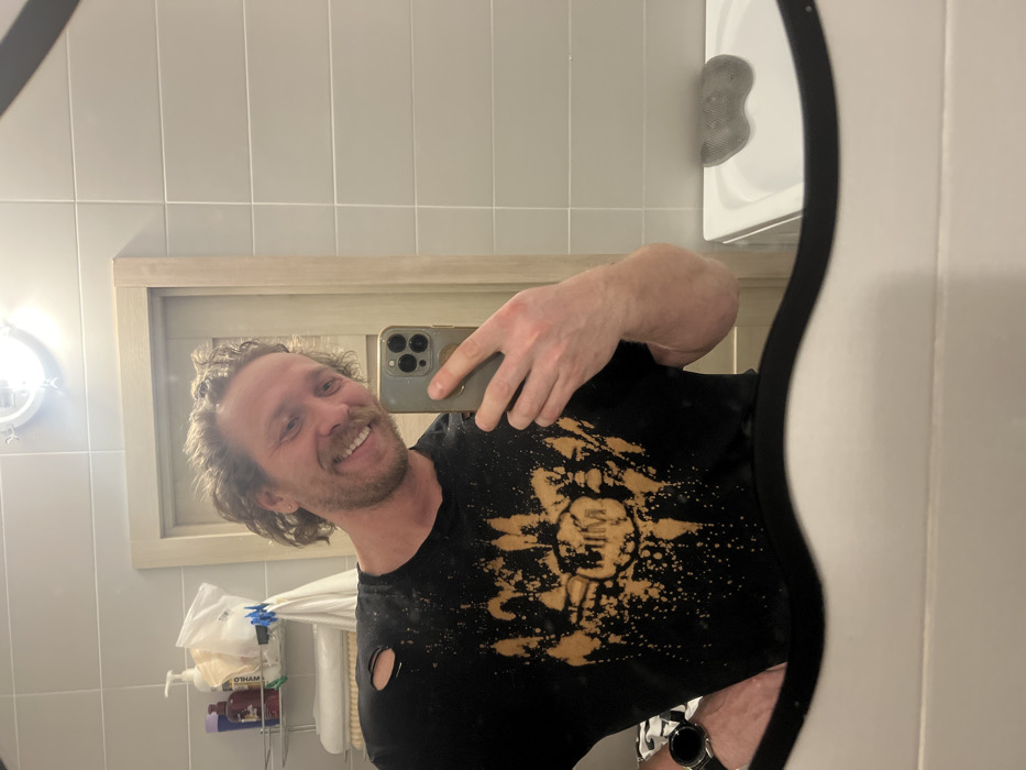 Within a bathroom located in Murino, Russia, a male subject is captured in a mirror selfie. The individual, possessing curly light brown hair and a trimmed beard and mustache, smiles broadly at the camera. He wears a dark t-shirt with a distinct bleached splash pattern centered around the letters "MJM" and exhibits two visible tears near the left shoulder. A dark smartwatch is present on his left wrist. His right hand holds a grey smartphone with multiple camera lenses, used to photograph his reflection. The bathroom environment visible in the mirror includes white rectangular wall tiles, a light-colored wooden door frame, and a round overhead light fixture. To the left, a metal shelving unit displays various toiletries and white folded items secured by a blue clip. Below the mirror's wavy bottom edge, a white porcelain sink contains a grey, textured, contoured mat.