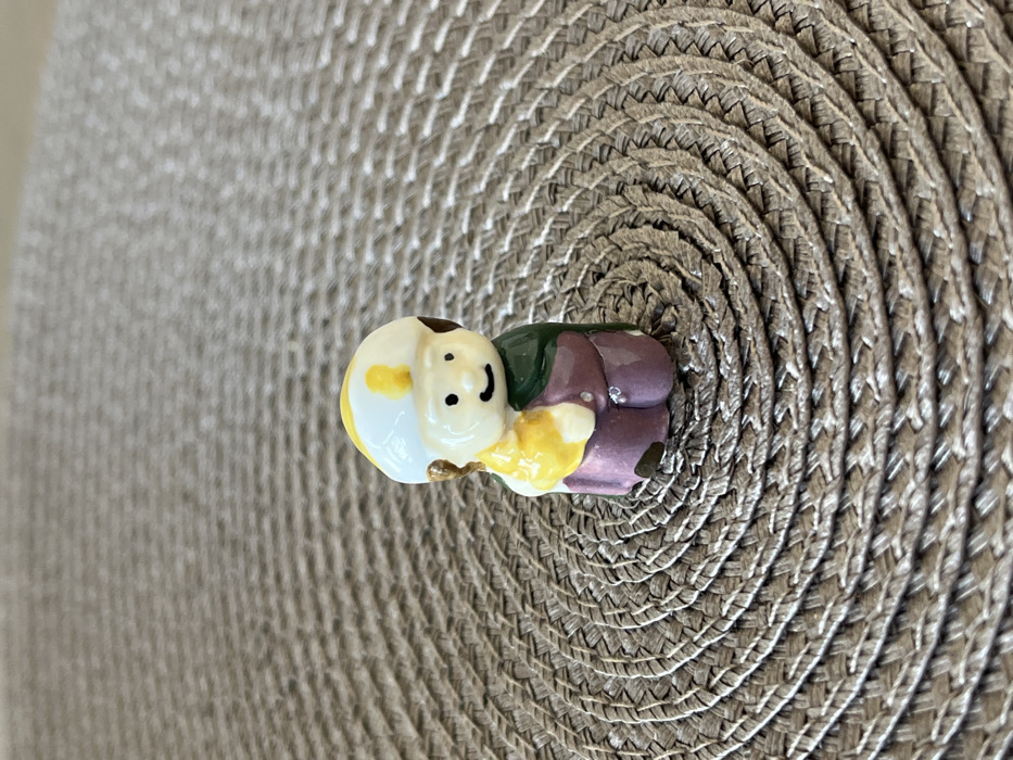 A miniature ceramic figurine rests on a tan woven surface. The figurine depicts a smiling character with a white and yellow head, a green jacket, and purple pants. Its tiny painted features are visible. The woven surface consists of concentric circles, creating a textured background. The figurine is positioned near the center of the frame.