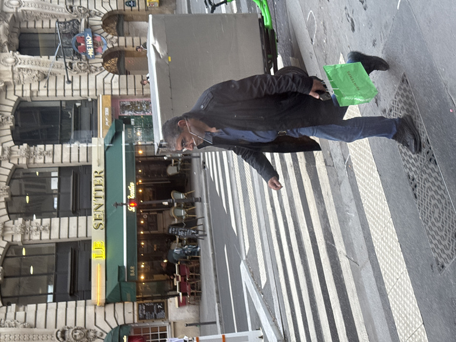 This image captures a street scene in Paris, France, at 23 Rue des Petits Carreaux, 75002, near the Sentier Métro station. A middle-aged man is the primary subject, captured mid-stride, walking from left to right across a white-striped pedestrian crosswalk. He has graying hair and stubble, wears a dark, unbuttoned, knee-length jacket over a blue collared shirt, blue jeans, and dark athletic shoes. A clear nasal cannula is visible in his nostrils, with tubing extending over his ears. He holds a dark-colored smartphone and a bright green shopping bag, emblazoned with "PRINTEMPS," in his right hand. Behind the man, a large, rectangular, silver-grey cargo box, consistent with a delivery container, is visible, partially mounted on a bright green bicycle trailer frame. The street features a paved sidewalk with a metal grate and a clearly marked pedestrian crossing. The background is dominated by a multi-story, cream-colored Haussmannian-style building with an ornate stone facade, featuring arched windows and decorative carvings on its upper levels. The ground floor houses "Le Sentier," a bar/café with a green awning and a prominent yellow neon sign displaying "LE SENTIER." Several patrons are visible seated at tables inside the establishment, and some red outdoor seating is present. To the right of the bar, a distinctive circular "MÉTRO" sign, characteristic of the Paris Métro, is affixed to the building, indicating the Sentier station. Two other individuals are discernable on the distant sidewalk near the Métro entrance. The sky appears overcast.