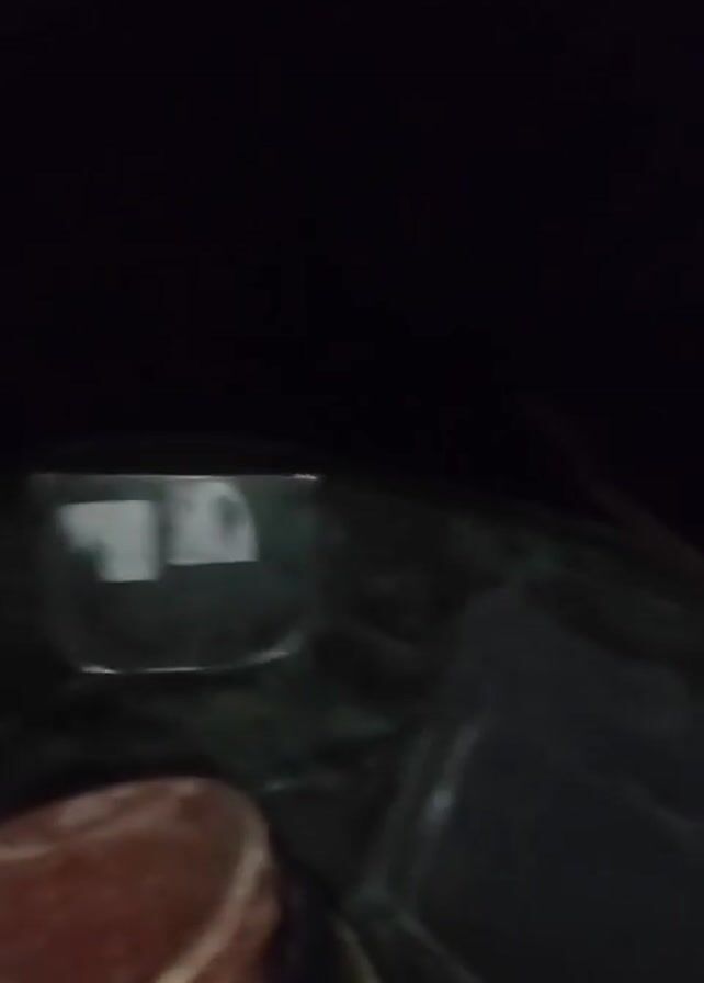 nighttime scene on what appears to be a boat. There is a container visible, possibly glass or plastic, with white markings or labels on it. In the foreground, there's a round, red object, possibly food like a piece of meat, on a container or surface. The camera pans to show lights reflecting on the water in the dark distance. The sound of a motor is audible.