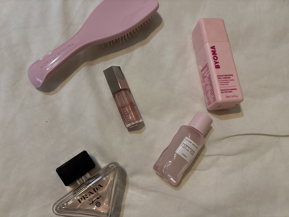 This scene, located in Quarteira, Portugal, displays five personal care and cosmetic items arranged on a light-colored, wrinkled fabric surface. Visible objects include a triangular clear glass Prada Milano perfume bottle with a black cap, a rectangular Fenty Beauty lip gloss tube containing a peach-toned product, a pink Tangle Teezer hairbrush, a light pink Glow Recipe Watermelon Glow PHA+BHA Pore-Tight Toner bottle, and a pink rectangular Byoma Moisturizing Gel-Cream container. No individuals or active interactions are depicted; the items are stationary. Distinct shadows are present on the fabric.