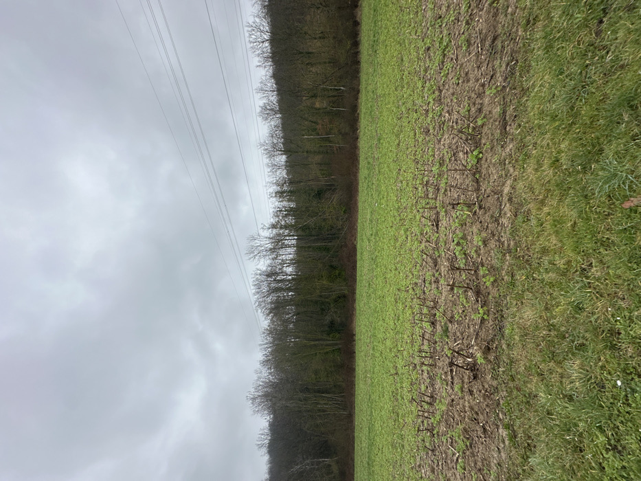 The scene depicts a rural landscape in Marcoussis, France, under an overcast sky. The upper third of the image is dominated by a uniform, light grey, cloud-filled sky. Four parallel, dark-colored power lines traverse horizontally across the upper right quadrant of the sky. Below the sky, a dense line of mostly bare deciduous trees forms the horizon, their branches a dark brown and grey, suggesting a dormant state. Scattered patches of darker green indicate either evergreen trees or dense undergrowth within the forest line. The middle ground consists of an agricultural field, partially covered by vibrant green, low-lying vegetation. Interspersed within this green growth are visible patches of brown soil, from which numerous short, dark plant stubble remnants, approximately 10-15 centimeters in height, protrude in a somewhat linear pattern, indicative of recent harvesting or cultivation. The immediate foreground shows a strip of uncultivated lighter green grass and sparse vegetation, with exposed soil visible in patches. No individuals, animals, vehicles, or specific activities are present within the frame. The lighting is diffused and even, consistent with an overcast daytime setting, and the bare trees suggest a late autumn, winter, or early spring season.