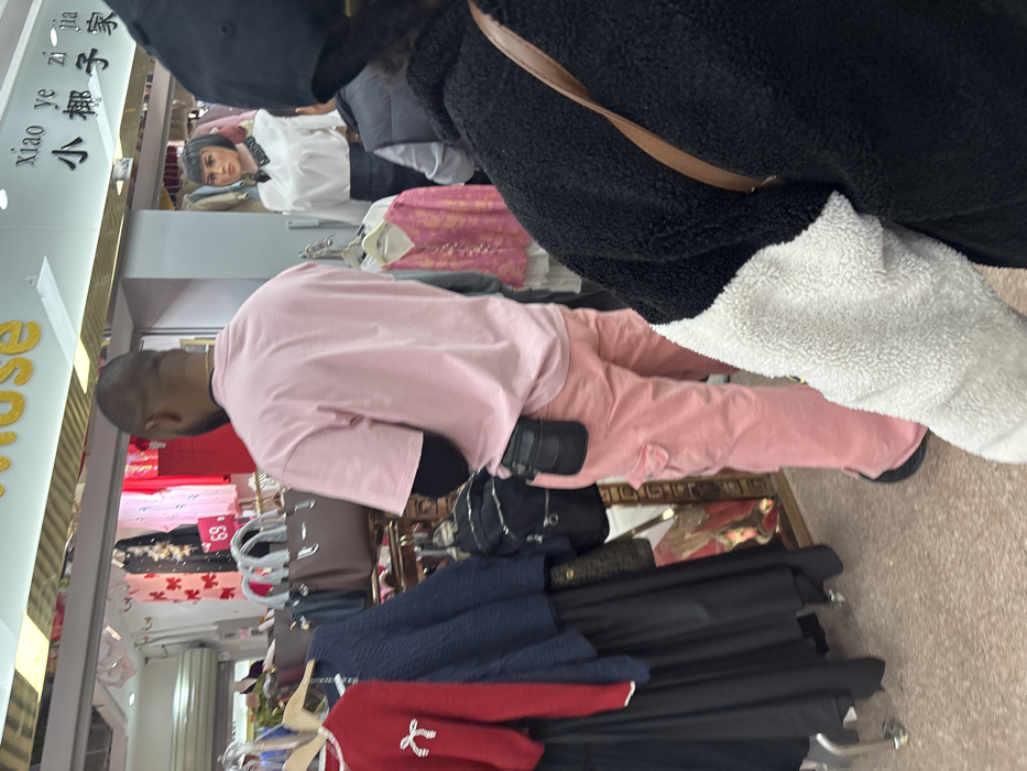 The scene is an interior view of a retail establishment, likely a clothing or fashion store, located in Yuexiu District, China. A male individual, positioned centrally and facing away from the camera, wears a light pink short-sleeved t-shirt over a black long-sleeved undershirt, pink cargo pants, and dark footwear. A black waist pouch is attached to his right hip, and a small black backpack hangs from his left side. In the immediate foreground on the right, the back of a person wearing a black cap and a black and white sherpa-style jacket is partially visible, with a brown bag strap crossing their right shoulder. To the left of the central figure, a clothing rack displays a red long-sleeved top with a white bow, a dark blue textured sweater, and black skirts. Between the central figure and the foreground, a display rack holds multiple brown handbags with light handles. In the background, a female mannequin with dark hair and a serious expression is visible, dressed in a white collared blouse with a black bow and a black skirt. Another partially obscured figure or mannequin is present behind the central individual, wearing a grey vest. Overhead signage includes a partial "rose" in gold script and Chinese characters "小椰子家" ("Little Coconut Home"). A price tag displaying "69" is visible on a background item. The floor is a light, possibly tiled, surface.