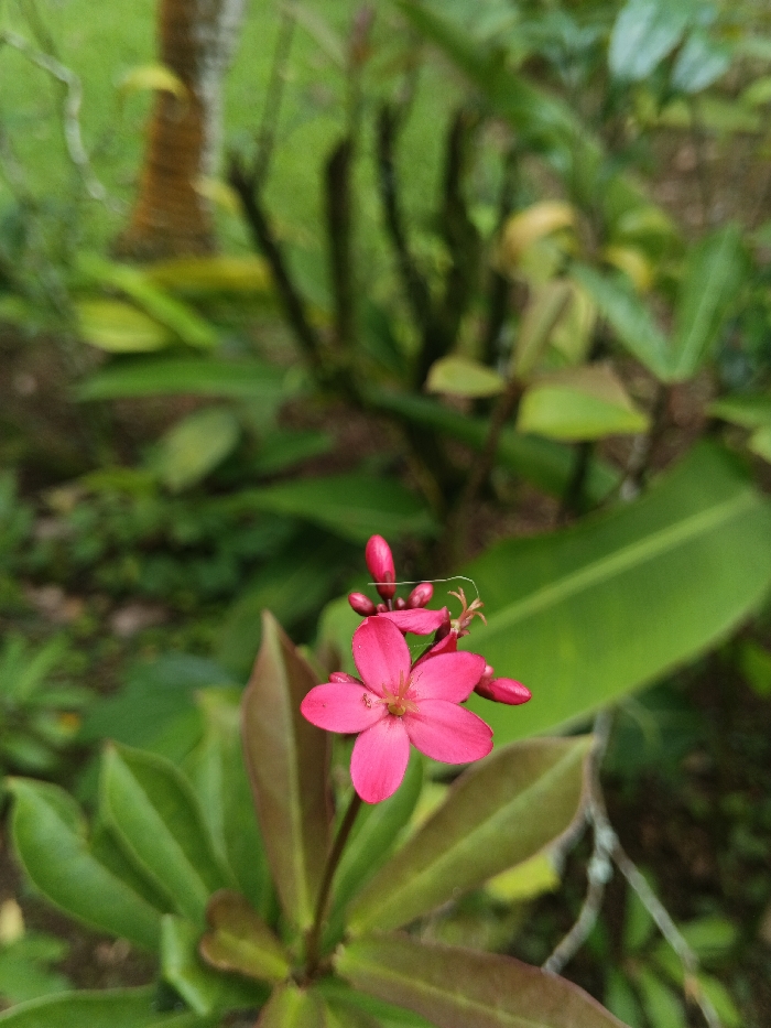 An extreme close-up photograph taken in Trairão, Brazil, depicts a vibrant pink five-petal flower with a light-colored pistil and stamens, positioned slightly right of the frame's vertical center. Several unopened pink flower buds are visible surrounding the main bloom. The flower is part of a plant with green and reddish-brown leaves in the foreground and midground. The background consists of heavily blurred, lush green foliage and darker plant stems, with a vertical brown element (possibly a tree trunk) discernible in the upper left. A thin, white, irregularly curved strand, possibly spider silk or plant fiber, is visible above the main flower and extending towards a bud. A small dark speck is present on one of the flower's petals. The scene is illuminated by natural light.