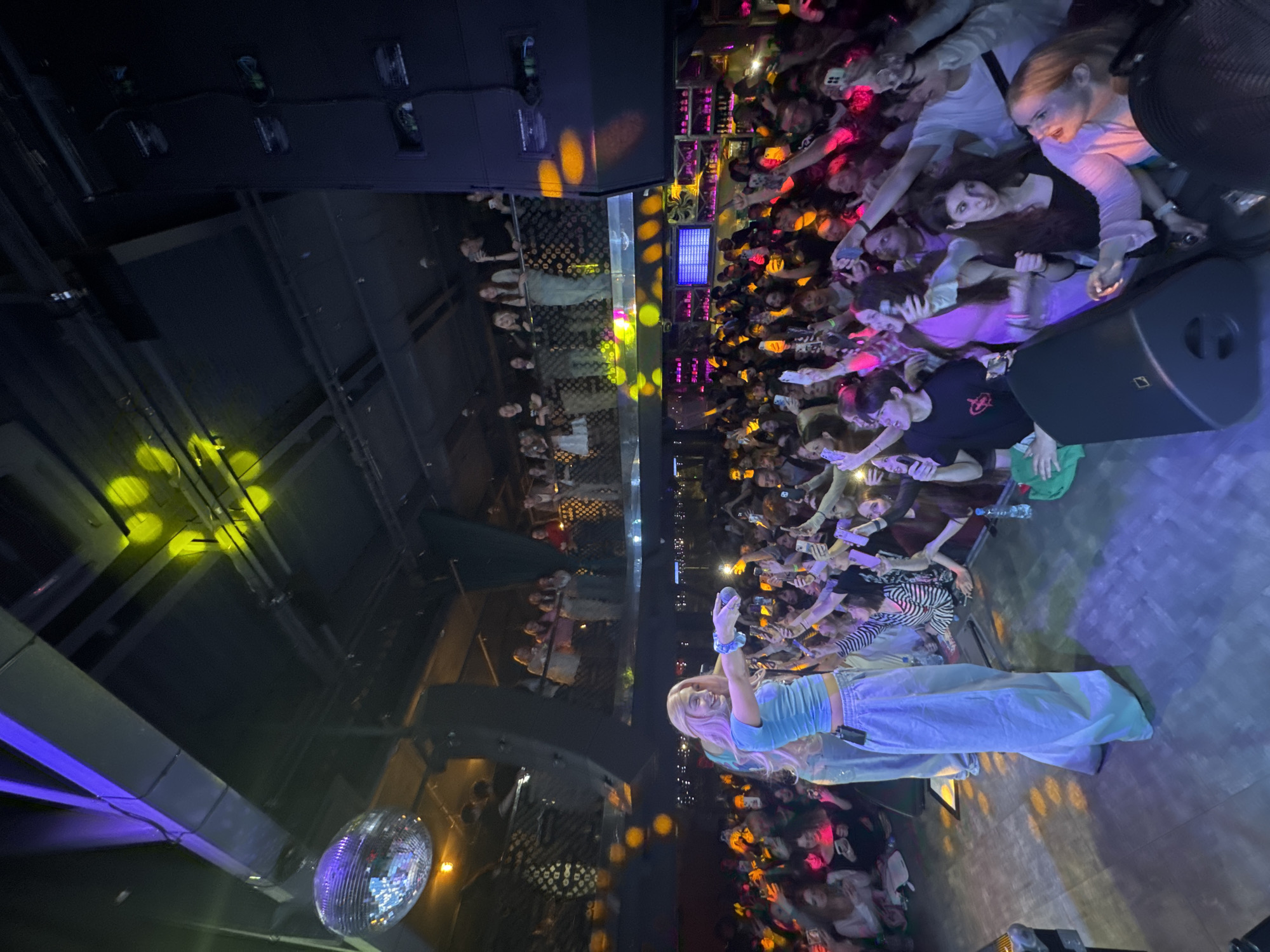 A performer, seen from a low angle, interacts with a large, densely packed audience in a concert venue. The venue appears to be in the city of Naberezhnye Chelny, Russia. The performer is a young, light-skinned woman with long blonde hair. She is dressed in a light blue crop top and baggy pants. She holds a microphone in her right hand and a phone in her left, appearing to take a selfie with the crowd. The audience is a sea of faces and raised arms, with many people holding up their phones to capture the moment. The lighting is dynamic, with purple, yellow, and orange lights illuminating the scene. In the background, a balcony area can be seen with additional onlookers. A disco ball hangs from the ceiling.