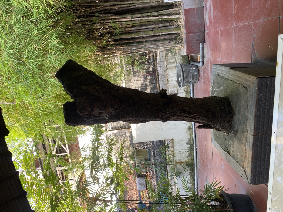 The image displays an outdoor scene in Lhokseumawe, Indonesia, under bright daylight. A dark, heavily textured tree trunk, bifurcated at its top, is centrally positioned, emerging from a large, square planter box composed of dark, ridged stone or concrete panels. The ground surface is covered with reddish-brown square tiles. To the immediate right of the central tree, a dense stand of green bamboo stalks with vibrant foliage rises from a lower, reddish-brown planter box. A gray plastic basket rests on the tiled floor near the base of the bamboo grove, with a white PVC pipe extending horizontally from the bamboo planter across the tiles. To the left of the central tree, a low, light-colored concrete wall, showing discoloration at its base, is visible behind a smaller potted plant. Beyond this wall, a dark mesh or netting is suspended, behind which two towels hang on a line. Further in the background, a brick wall and the upper section of a building with exposed wooden beams and a corrugated roof are discernible. A dark roof overhang is partially visible in the upper-left corner of the frame. No individuals are present in the scene.