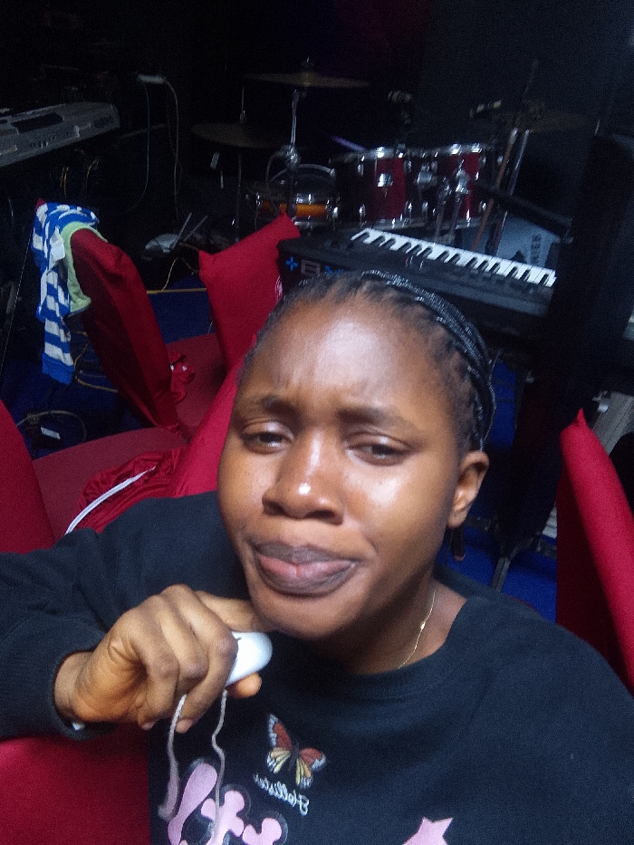 young Black woman in a dimly lit music studio located in Onitsha, Nigeria