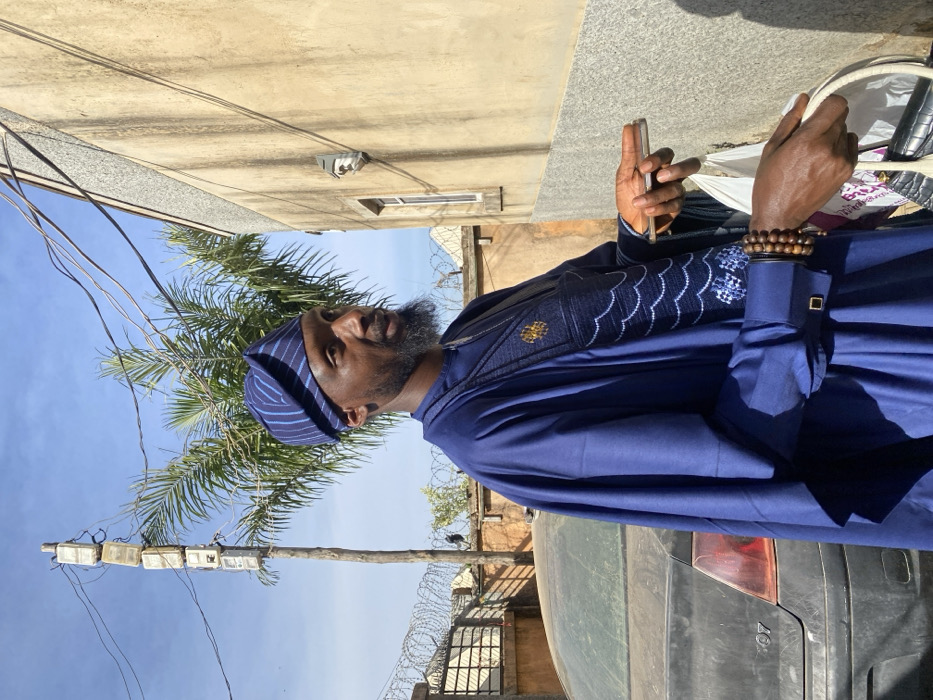 An outdoor, mid-shot photograph taken in Jos, Nigeria, features an adult male standing under a clear blue sky