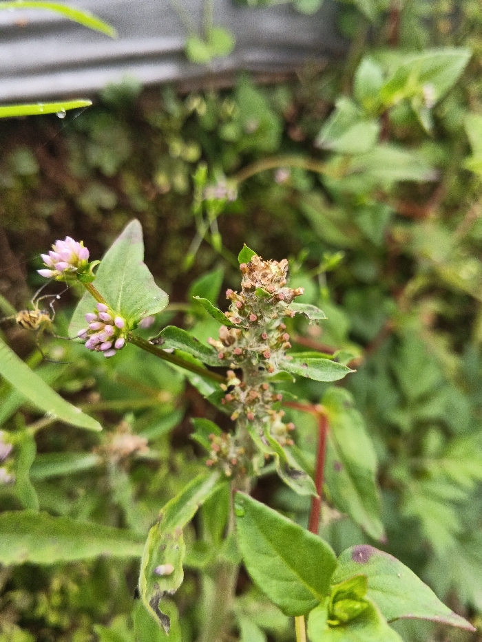 This close-up image depicts a small, green herbaceous plant in an outdoor, overgrown environment within the city of Pinnwe, Myanmar (Burma). The primary subject is a plant stem featuring both developing light pink flower clusters, each approximately 5-7mm in diameter, and mature, brownish-green seed head clusters, approximately 10-15mm in height, which exhibit a textured, possibly fuzzy appearance. Multiple green leaves are present, some displaying minor dark discoloration or curling at the edges. A reddish-brown stem is visible. In the upper left quadrant, a single water droplet rests on a thin green leaf, and a fine, white filament, possibly spider silk, is visible near one of the pink flower clusters. The background consists of densely packed, out-of-focus green foliage, with a blurry gray object positioned in the upper left background.