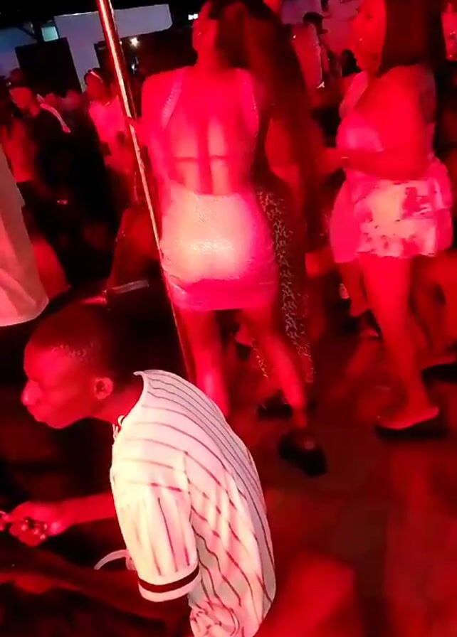 The video, taken from an eye-level perspective, shows a group of people dancing in a club or party setting illuminated by red lights. A man wearing a white striped baseball jersey is sitting on what appears to be a red cushion, working with something in his hands. He is positioned in the foreground and slightly to the left. Behind him, a crowd of people are dancing. A woman in the center wears a shiny silver dress. Another woman to her right is wearing a floral print outfit. A metal pole is visible on the left, and the overall atmosphere suggests a lively and festive occasion. The video is a little shaky.