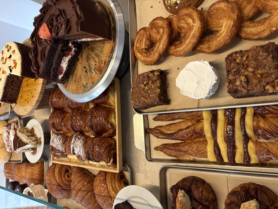 This image displays a static, detailed view of a wide assortment of baked goods and desserts arranged for sale within what appears to be a commercial establishment, such as a bakery or patisserie, located in Madrid, Spain. The items are presented on various metal and wooden trays, cake stands, and plates, predominantly on a light-colored countertop or display surface. In the upper section, a partial carrot cake with white cream cheese frosting and candied fruit garnishes sits on a wooden stand. Adjacent to it, a dark chocolate layer cake with chocolate ganache frosting, a red berry filling, and a strawberry slice garnish is displayed on a silver cake stand; a significant slice has been removed from this cake. A slice of another layered dessert, possibly banana cream or cheesecake with a caramel or chocolate drizzle, rests on a white plate. Behind these, additional bread rolls and individual dark pastries in paper liners are visible. The mid-ground features two prominent trays of croissants. On the left, a metal tray holds numerous golden-brown, flaky croissants. To the right, a wooden tray contains various filled croissants, some dusted with powdered sugar, while others show exposed chocolate or cream fillings. The foreground exhibits more pastries arranged on metal trays lined with parchment paper. These include multiple square brownies, densely packed with visible nuts. Next to them are several golden-brown palmiers, characterized by their distinct heart or 'elephant ear' shape. A small, irregular dollop of white cream or frosting is positioned near the brownies. Also visible is a long, rectangular pastry with alternating light and dark horizontal stripes of filling, and another tray featuring individual, dark, coiled pastries, some topped with a light-colored cream or sugar. No individuals are present in the scene.