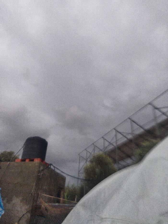 This image depicts an outdoor scene in Khan Yunis, Palestinian Territory, under a heavily overcast and dark gray sky that occupies approximately two-thirds of the frame. The overall image exhibits significant grain and some motion blur. In the mid-left, a black cylindrical water tank rests on a elevated concrete structure. Reddish-brown rectangular objects, possibly bricks or pallets, are visible directly beneath the tank. Dark wires or pipes extend from the concrete structure into the midground. Patches of green foliage are visible behind and to the right of this structure. In the mid-right, a large metal grid structure, resembling a fence or barrier, extends diagonally upwards. It is composed of a framework of metal bars and wires. More green foliage is present behind this metal structure. A large, light-colored, wrinkled material, possibly a tarp or sheet, partially fills the bottom right foreground, obscuring any ground details. No people, specific actions, or interactions are visible within the frame.