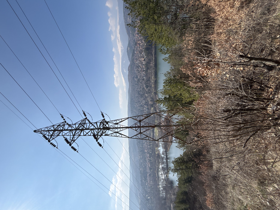 The image presents an elevated, panoramic view of the area near Kokalyane, Bulgaria, overlooking Pancharevo Lake and the surrounding landscape. In the immediate foreground, a hillside is covered with dormant deciduous bushes and trees exhibiting bare branches and brown foliage, interspersed with some green coniferous trees. A large, dark-colored metal lattice power pylon dominates the midground, positioned slightly off-center to the left, with multiple power lines extending horizontally across the frame under a clear, bright blue sky. Beyond the pylon and the immediate hillside, the serene, blue-green waters of Pancharevo Lake stretch across the scene, reflecting the daylight. On the far side of the lake, the town of Kokalyane is visible, characterized by numerous residential and commercial buildings nestled amongst undulating terrain and patches of vegetation. In the distant background, a range of mountains, specifically the Rila Mountains, rise prominently, with their higher elevations clearly covered in snow, under a sky with minimal cloud cover. No individuals or animals are present in the scene. The overall lighting suggests a clear, sunny day, likely in late autumn, winter, or early spring, given the dormant vegetation and snow-capped peaks.