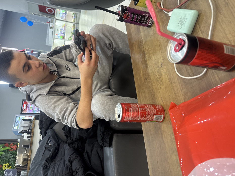 A young male individual, possibly an adolescent, with short dark hair, is seated indoors, focusing on a smartphone held in both hands. He is wearing a grey Nike tracksuit, consisting of a zippered hoodie and matching sweatpants. His posture is attentive to the device. The setting appears to be a commercial establishment, specifically a lounge or waiting area in Kazanlak, Bulgaria. The male is situated on dark grey or black upholstered seating. To his left, a pile of dark-colored jackets or clothing rests on the same type of seating. In the foreground, a dark wood-patterned table displays several items. There is an open red Coca-Cola can, oriented with its nutritional information label facing the viewer. Adjacent to it, a purple "HELL Energy Drink" can, identified as "Black Cherry" flavor, stands with a black straw inserted. Further right, a red "HELL Energy Drink" can is present with a pink bent straw, alongside a light blue portable power bank connected by a white cable, and a small yellow vape device. A glossy red plastic bag or package is partially visible in the lower left foreground. The background reveals more of the establishment. To the left, a counter features a professional coffee machine with "Lavazza" branding. Next to it, a glass-fronted refrigerator displays beverages and bears "DEVIN" and "XIXO" logos. Further right, various display cases or shelves are visible, containing merchandise or products. Two blue balloons float near the ceiling in the mid-background. The overall lighting is bright and even.