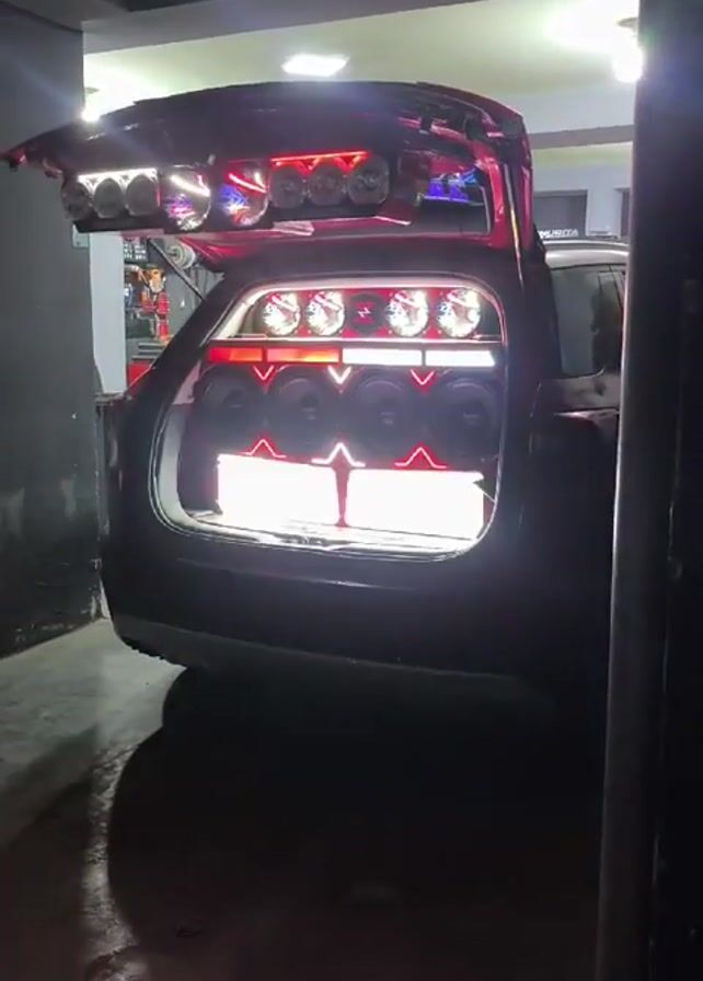open trunk of a maroon SUV, heavily modified with car audio equipment