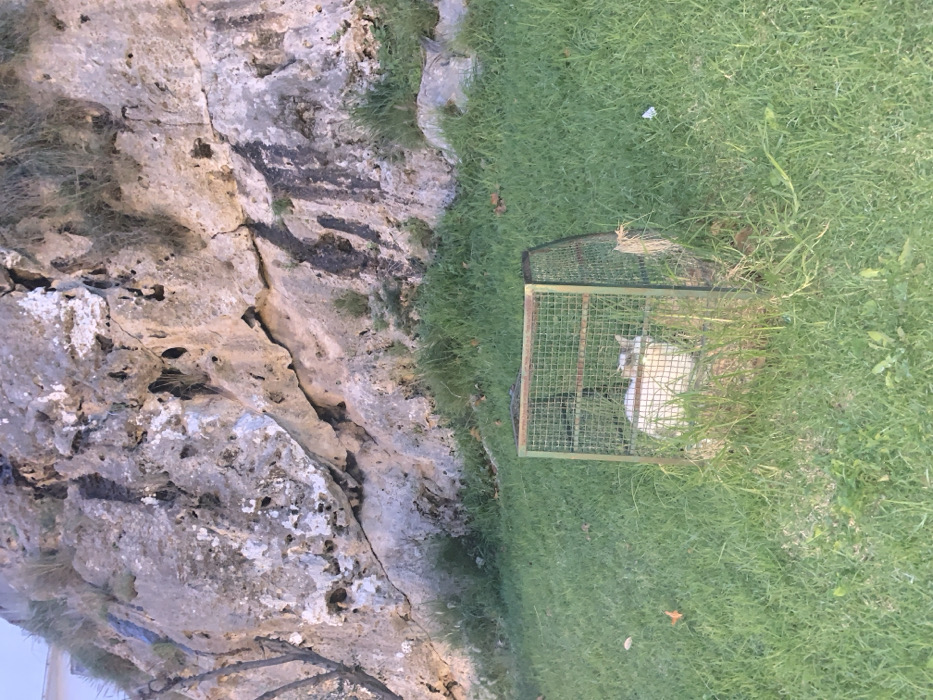 A white and tan goat is inside a metal cage on a grassy lawn. A large, light-colored rock formation with dark streaks and crevices is on the left side of the frame. The grass extends around the cage and to the right, filling most of the image. The photo is taken outdoors in daylight.