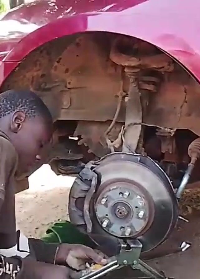 A person wearing a brown hoodie with white lettering and design on the left arm is shown sitting on the ground next to a raised maroon car, working on the front wheel area