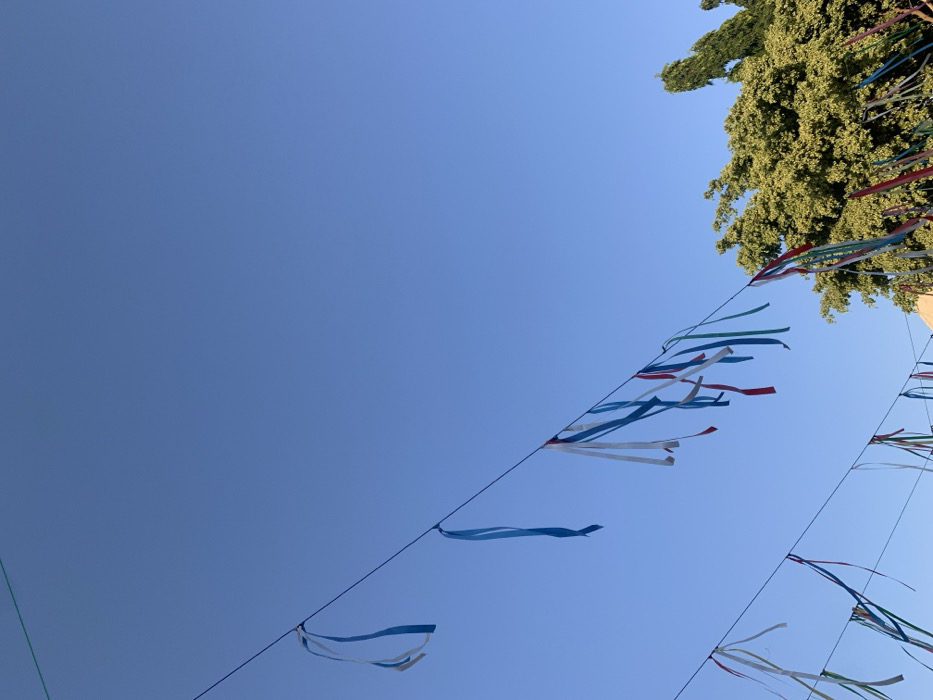 The scene, located in Tempure, Nigeria, depicts an outdoor environment under a clear, bright blue sky that occupies the majority of the frame. Multiple thin, dark wires or lines are strung diagonally across the upper and mid-ground. Attached to these lines are numerous multi-colored fabric ribbons in shades of white, light blue, dark blue, red, and green, which hang loosely and appear to be in motion. In the lower right quadrant, the dense green foliage of a large deciduous tree is visible, partially obscuring a light-colored architectural element at the very bottom center. To the immediate right of the large tree, a taller, slender, dark green coniferous tree stands partially within the frame. No individuals, direct actions, or specific interactions are discernible.