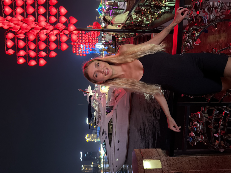 At night in An Hải Ward, Vietnam, a fair-skinned female with long, wavy blonde hair, dressed in a black sleeveless romper, stands on a waterfront promenade, smiling directly at the camera. She holds onto a dark metal railing, which is densely covered with various colored padlocks. To her left, a stone pillar with an illuminated rectangular light is visible. Behind her, a dark body of water reflects city lights. Two white luxury yachts are moored on the water; the closer one displays the registration "DN-0877". To the right of the woman, a large, vertical structure decorated with multiple illuminated red heart-shaped lights stands prominently, with a smaller, similar structure behind it. In the background, a brightly lit city skyline with multiple tall buildings is visible across the waterway under a dark sky. Several other indistinct figures are present on a further section of the promenade behind the decorative lights.