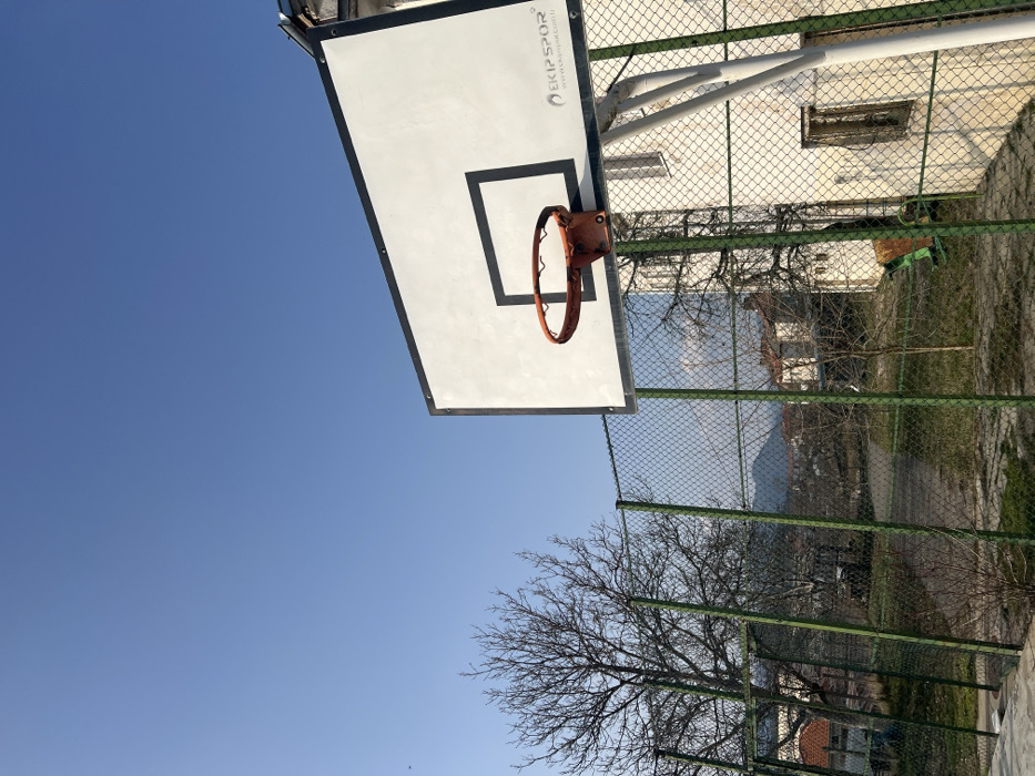 An outdoor basketball court in Byal Izvor, Bulgaria, is shown under a clear, cloudless blue sky