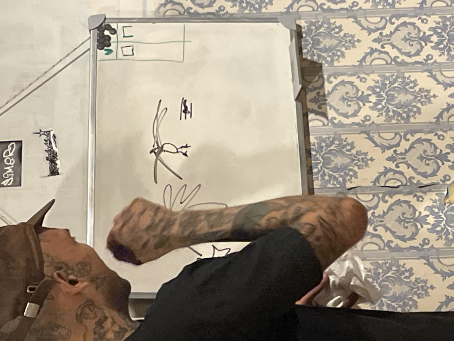 A man with tattoos on his arms, neck, and face is seen in the foreground. He wears a cap and a black shirt. Behind him is a whiteboard with a checklist at the top left corner and drawings in black marker, including a figure with stick legs and a vertical line with a horizontal line through the middle. A patterned blue and white wall covering is visible behind the whiteboard. Another whiteboard is partially visible to the left.