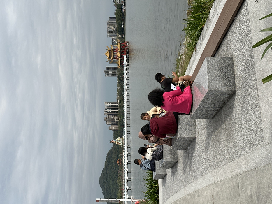 A group of people sits on tiered steps near a body of water. Across the water, a bridge stretches towards a hill, with buildings visible beyond. A large, ornate structure sits closer in the water near the bridge. The sky is overcast. Vegetation lines the edge of the seating area. The people are looking at the water or at their phones.