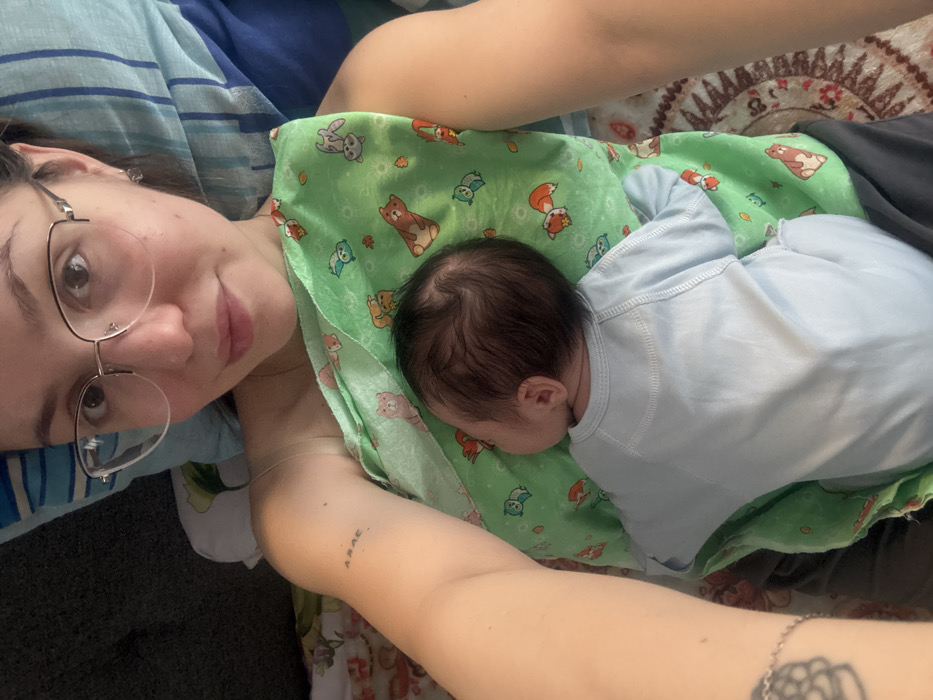 The image displays an adult female and an infant in an indoor domestic setting in Chaikovsky, Russia