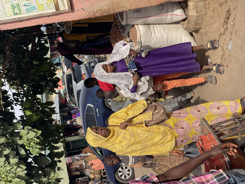 The image depicts a crowded outdoor scene in what appears to be a market area within Samaru, Nigeria, under bright daylight conditions