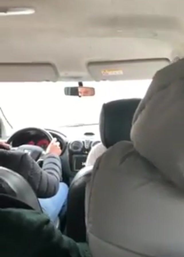 The interior of a car is shown from the back seat. The driver, wearing a dark puffer jacket and jeans, has his hands on the steering wheel. The driver is visible in the rearview mirror. Another person is in the passenger seat, wearing a light-colored jacket. The car is traveling on a wet highway with limited visibility due to fog or rain. The car's dashboard and infotainment system are visible. The time displayed on the screen is 16:11. The focus is on the driver and the road ahead.