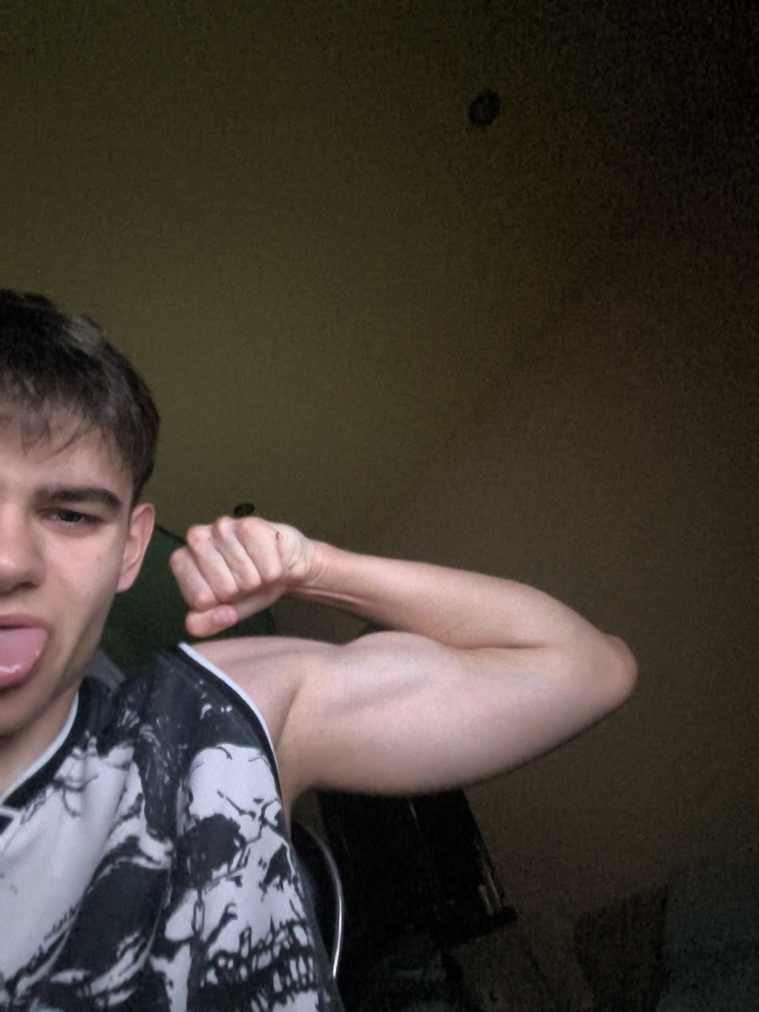 A young man is posing for a selfie indoors. He is wearing a t-shirt with a skull design. He is flexing his right arm, showing the bicep muscle. His tongue is sticking out. The background is a dimly lit wall, possibly greenish-brown in color. A circular dark spot can be seen on the upper part of the wall. The image was not taken in Dobrich, Bulgaria.