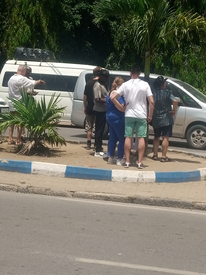 This image depicts an outdoor scene in the Ganjoni/Shimanzi ward of Kenya, under bright sunlight. Seven individuals are visible near two parked vehicles on what appears to be a roadside or parking area adjacent to a paved road. To the left, a white van, possibly a Toyota Hiace, is parked with its rear facing partially towards the camera. It has a roof rack loaded with multiple black bags. A partial license plate reading "KCD 213" is visible. Two males stand near this van; one man in a white short-sleeved shirt gestures with his right arm towards the left, while another individual, partially obscured, stands nearby. To the right of the scene, clustered around the front of a silver minivan or SUV (partial front right side visible), are five individuals. From left to right within this group, there is a male in a black t-shirt and light brown shorts; a male in a striped t-shirt and dark trousers; a female in a blue jumpsuit or dress with white sneakers; a male in a white t-shirt and light green shorts; and a final individual (gender indeterminate from this angle, possibly female) wearing a dark patterned top, dark shorts, and a hat, with hands on hips. This group appears to be standing and observing or conversing, facing generally towards the right and away from the camera. The ground where the people are standing is a dry, earthy patch. A small, green palm-like plant grows in this area, near a curb. The curb is painted with alternating blue and white sections, separating the dirt area from a grey asphalt road that occupies the foreground of the image. Lush green foliage and trees form the background.