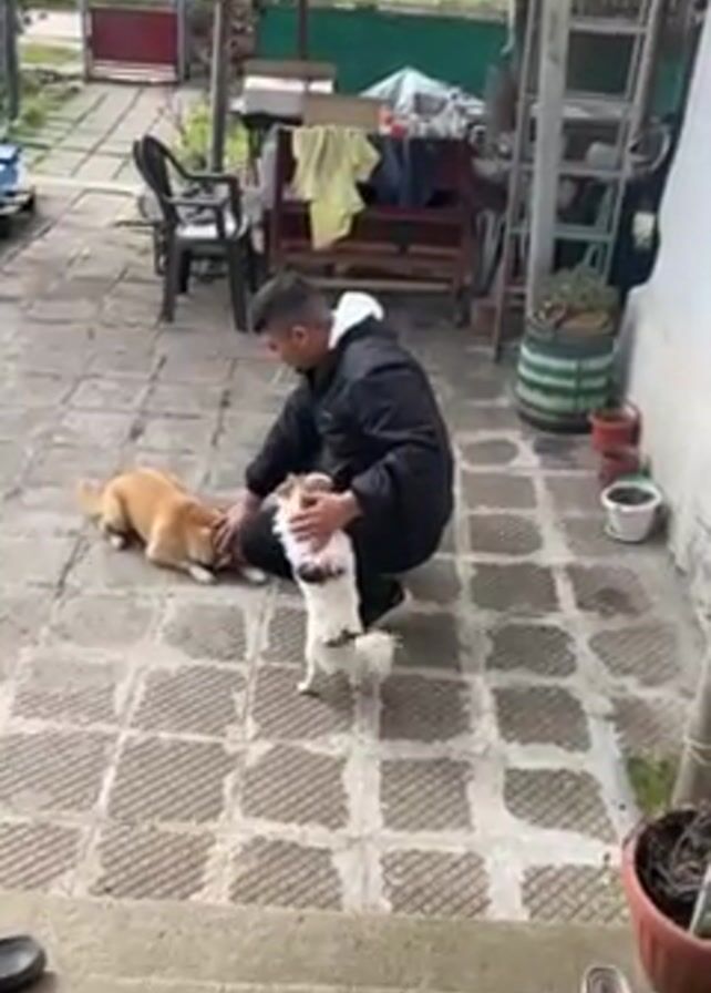 A man is kneeling in a paved outdoor area, interacting with two dogs. The first dog is a medium-sized, light brown dog lying on the ground, and the man is petting its neck. The second dog is smaller, white and brown, and stands on its hind legs, leaning against the man's leg, seemingly seeking attention. The man is wearing a black jacket with a white hood. He is holding a cigarette in his mouth. The area is a patio or backyard with weathered paving stones. There is a chair, table with items on it, ladder, and various potted plants. The overall impression is of a casual, everyday scene of a man interacting with his dogs in an outdoor space.