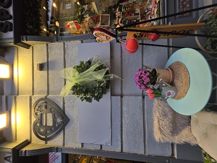 The scene depicts a decorated storefront or outdoor seating area on Stari trg, Ljubljana, Slovenia. The building facade is constructed of horizontal grey stone blocks. Affixed to the upper wall is a large, dark grey metal heart-shaped ornament featuring intricate paw print and floral cutouts. Below this, a blank rectangular grey panel is mounted. To the right, an ivy wreath with a prominent light green sheer bow is hung. Two rectangular warm lights are positioned above, illuminating the wall. To the far right, a shop window displays a collection of festive items, including red and white ornaments, a large heart-shaped object, and various small figurines. Partial lettering, "SP," is visible on the upper portion of the window frame. In the foreground, a round, light blue outdoor table is positioned. A circular woven mat rests on the table, supporting a terracotta pot containing a plant with numerous small purple flowers, and a small silver-colored watering can holding pink tulip-shaped decorative items. To the left of the table, a light-colored outdoor chair or stool with a fluffy, light brown cushion is partially visible. To the right of the table, a black metal A-frame stand holds a narrow wooden sign, with the word "SOUVENIRS" visible vertically. Red spherical ornaments hang from the top of the stand, and a wicker basket containing green foliage is situated at its base. No people are present.