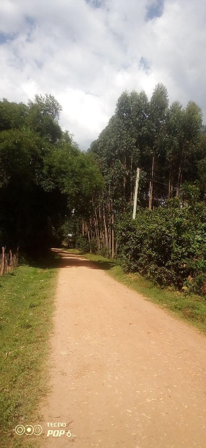 An unpaved, reddish-brown dirt road extends into the distance under a partially cloudy sky in Mahiakalo ward, Kenya
