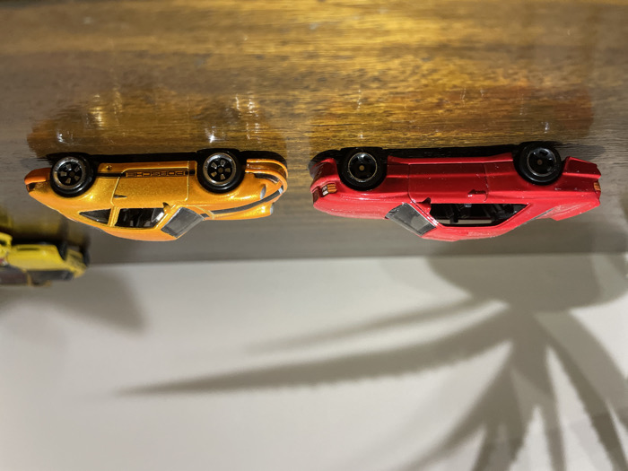 - "An indoor scene displays two die-cast toy cars positioned on a reflective, dark brown wooden surface" by FM-orEo22, licensed under CC BY 4.0
