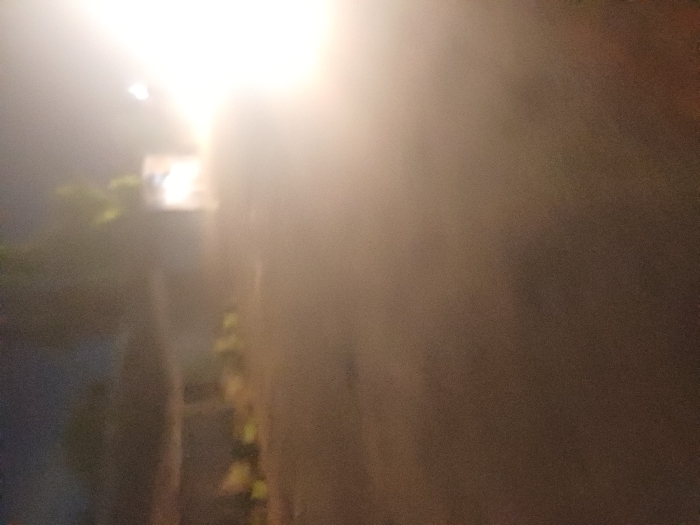 A foggy night scene depicts a narrow walkway or alley illuminated by a bright overhead light. The light obscures details, creating a hazy ambiance. Walls flank the path, one side appearing textured and solid, while the other features hints of greenery. The overall impression is blurred and unclear due to the heavy fog.