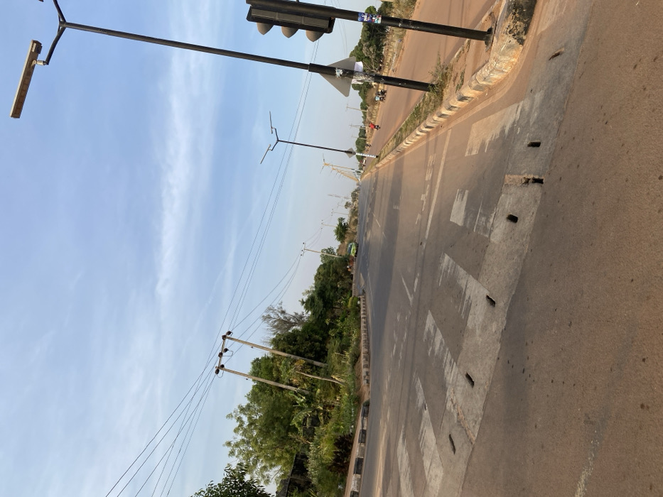 The image depicts an asphalt road intersection under a clear blue sky with faint cirrus clouds, located in the city of Television, Nigeria