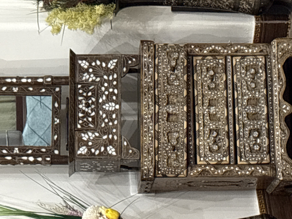 - "Three stacked ornate wooden furniture pieces with extensive white mother-of-pearl inlay are depicted against a light-colored wall in Munin, Syria" by FM-ihvq52, licensed under CC BY 4.0