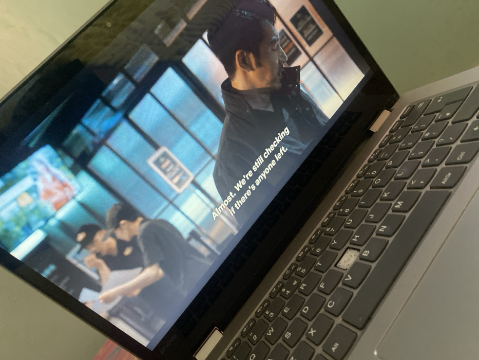 A silver-colored Lenovo laptop is depicted at an upward angle, showing its keyboard in the foreground and screen displaying a video. The screen features a male individual in the foreground, wearing a dark shirt and looking downwards. Subtitles reading "Almost. We're still checking if there's anyone left." are visible on the screen. In the blurred background of the video, two other individuals in dark uniforms and caps are partially visible, appearing to be behind a counter. The laptop's keyboard has black keys, with the 'T' keycap missing, exposing a white internal mechanism. The laptop rests on a patterned surface with red and brown tones, and a light green wall is visible in the background to the right. There is no identifiable information within the image to specify a location in Nairobi, Kenya.
