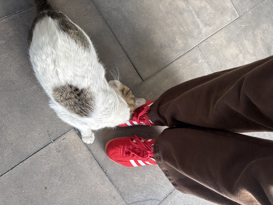 A person wearing brown pants and red sneakers stands on gray pavement. A white cat with gray markings is rubbing against the person's leg and red sneaker. The cat's head is close to the sneaker. The cat's tail is visible in the top left corner of the image. The scene is outdoors, likely on a street or sidewalk.