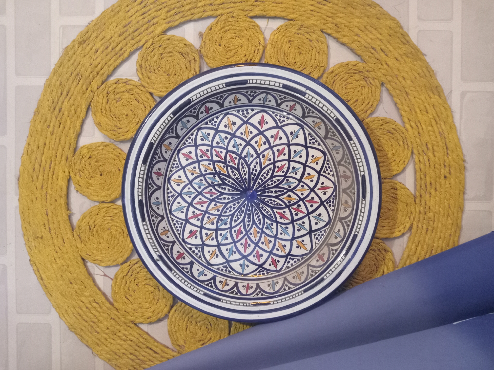 A high-angle shot depicts a ceramic serving dish resting on a circular mat, with a section of blue rolled paper partially covering the lower-right. The mat is constructed from concentric circles of braided yellow fiber with raised round pads of the same material attached to the outer border. The serving dish is decorated with a floral motif in white, blue, red, and gold. It is outlined with several concentric blue and white rings. The floor appears to be made of square tan tiles. The scene resembles interior decoration common in Essaouira, Morocco, which is famous for its arts and crafts. No people are visible.