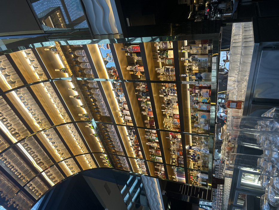 The image depicts the interior of a commercial establishment, identified as a bar or restaurant, located in Varna, Bulgaria. The dominant feature is a tall, multi-tiered liquor display wall that extends vertically across the frame, culminating in a concave, curved section at its apex. This display comprises multiple horizontal shelves, each individually illuminated from beneath by warm, linear LED strip lighting. The upper, curved shelves uniformly present rows of clear, empty spirit bottles. Below these, the straight shelves showcase a diverse collection of bottled alcoholic beverages, including various spirits, liqueurs, and champagne, distinguishable by their labels, liquid colors, and bottle designs. The display structure is framed by dark, reflective vertical dividers. In the foreground, a polished, reflective bar counter occupies the lower portion of the image. This counter is densely populated with numerous clear glass drinking glasses, both upright and inverted. A single amber-colored bottle with a white label is positioned on the counter near the center-right. No human figures are visible in the scene. The environment features prominent reflective surfaces and structured artificial lighting.