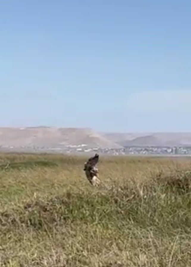 bird of prey standing on a small grassy mound, seemingly in a marshy or grassy field. The bird, which appears to be a hawk or eagle, is primarily dark in color with some lighter areas on its underside. The sky is clear and blue. In the background, there's a low mountain range and a city. The grass in the foreground is predominantly brown and dry.